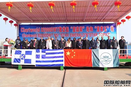 1月23日上午,扬子江船业集团为希腊CHARTWORLD船东建造的两艘82000DWT散货船(厂编N2137号和N2141号)在新扬子造船1#码头举行了隆重的命名仪式。两艘船被分别命名为“星翡翠”轮(STAR EMERALD)和“星黄玉”轮(STAR TOPAZ)。